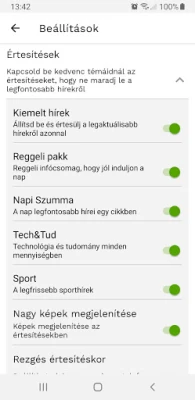 - Értesítések beállítása: beállíthatod, hogy szeretnél-e értesítéseket (push notifications) kapni a kiemelt hírekről, a 24.hu kedvelt napindító infócsomagjáról, a Reggeli pakkról, vagy a napi összefoglaló cikkünkről, a Napi szummáról. Ezeken kívül külön Sport és Tech&Tud hírek értesítő is beállítható.